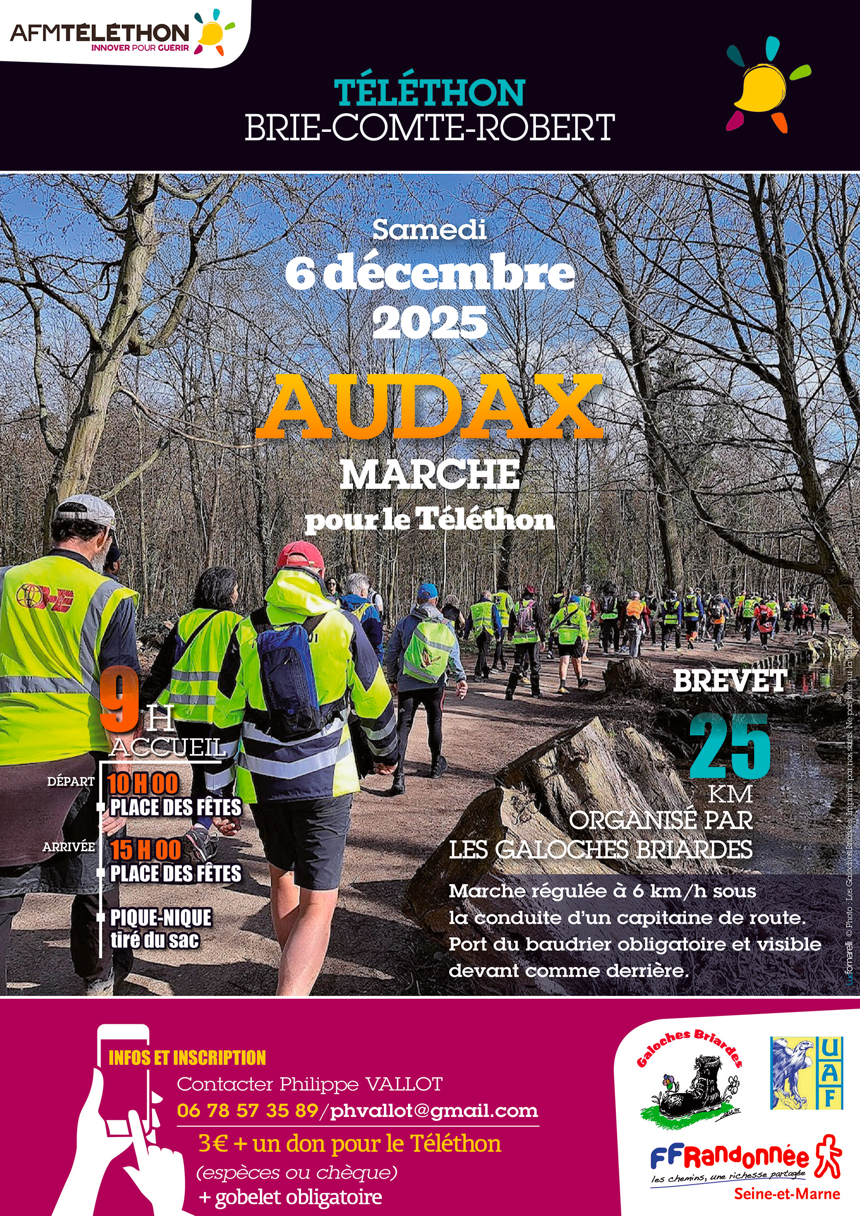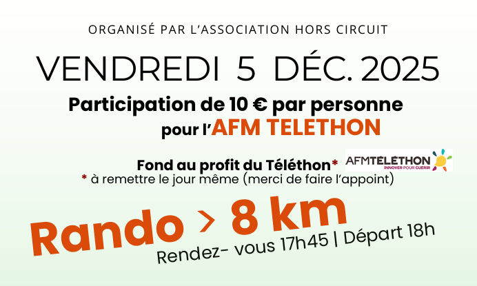 ORGANISÉ PAR L’ASSOCIATION HORS CIRCUIT VENDREDI 5 DÉC. 2025 Participation de 10 € par personne pour l’ AFM TELETHON Rando > 8 km Rendez-vous 17h45 | Départ 18h