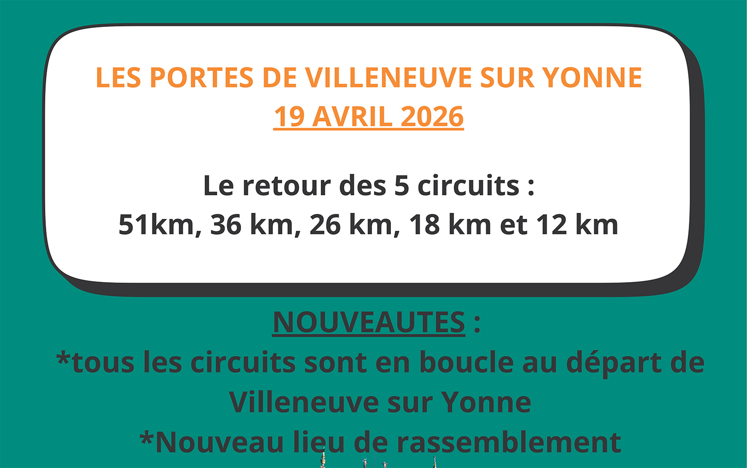 5 circuits de 51, 36, 26, 18 et 12 km au départ de Villeneuve sur Yonne, avec leurs fameux ravitaillements…